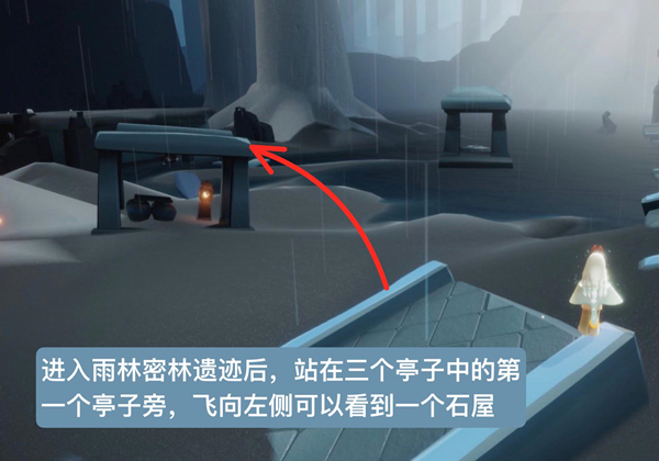 1、飞到雨林水母图,朝着左边的石屋飞过去。