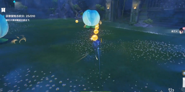 2、挑战2注意巨球来袭:此关利于夜兰的元素战技来快速移动来收集冒险币,收集期间还要注意躲避巨大弹球;